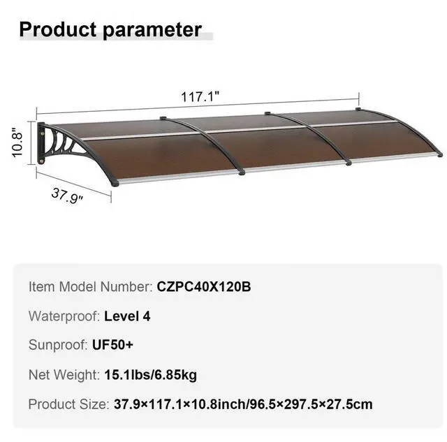 Waterproof: Level 4,Color: Brown Sheet/Black Bracket/ Silver Connector,Sunproof: UF50+,Item Model Number: CZPC40X120B,Material: PC Sheet + ABS Bracket + Aluminum Connector,Net Weight: 15 lbs / 6.85 kg,Product Size: 38" x 117" / 965 x 2975 mm