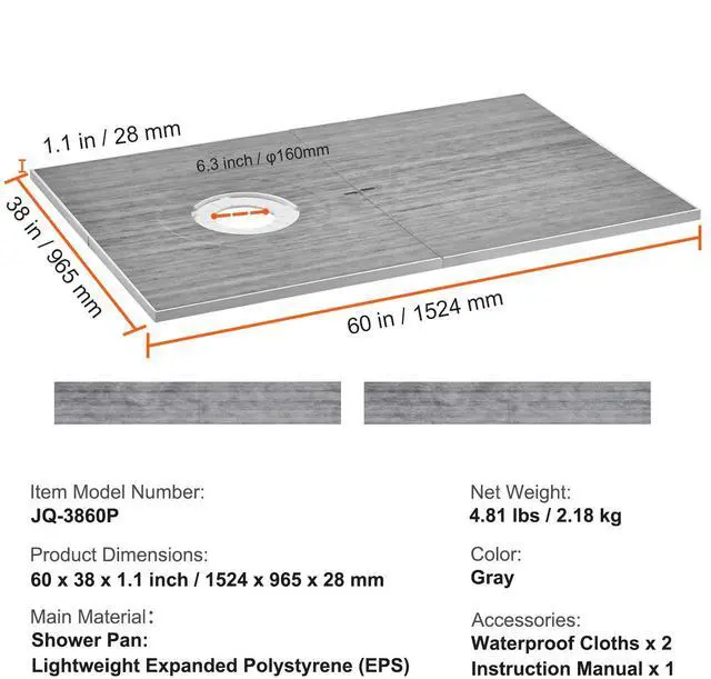 Model: JQ-3860P,Shower Pan Main Material: Lightweight Expanded Polystyrene (EPS),Product Dimensions: 60 x 38 x 1.1 inch / 1524 x 965 x 28 mm,Net Weight: 4.81 lbs / 2.18 kg