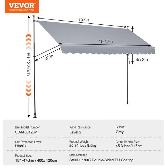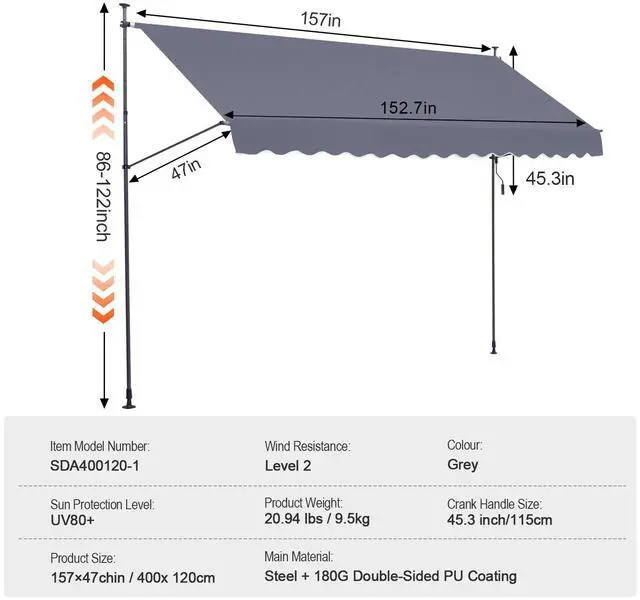 Crank Handle Size: 45.3 inch/115cm,Item Model Number: SDA400120-1,Wind Resistance: Level 2,Product Weight: 20.94 lbs/9.5 kg,Main Material: Steel + 180G Double-Sided PU Coating,Sun Protection Level: UV80+,Colour: Gray,Product Size: 157 × 47 inch/400 x 120 cm