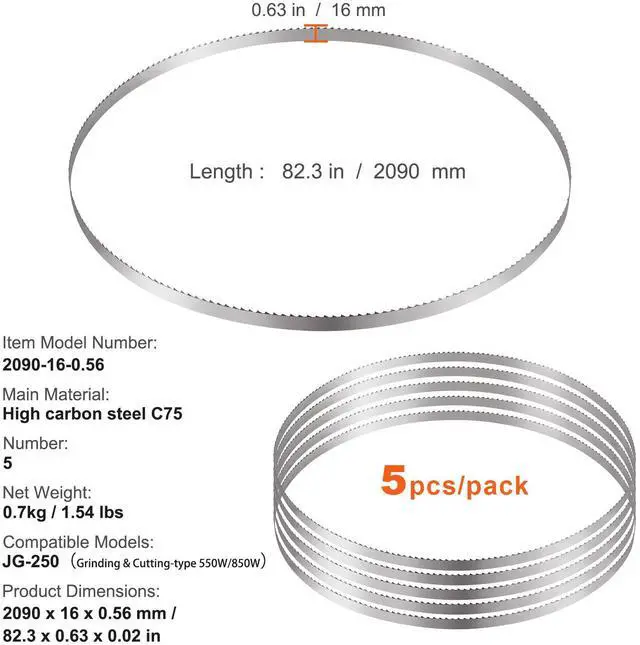 Number:5,Item Model Number: 2090-16-0.56,Compatible Model: JG-250 (Grinding & Cutting-type 550W/850W),Net Weight: 1.54 lbs / 0.7kg,Main Material: High Carbon Steel C75,Product Size: 82.3 x 0.63 x 0.02 inch / 2090 x 16 x 0.56 mm
