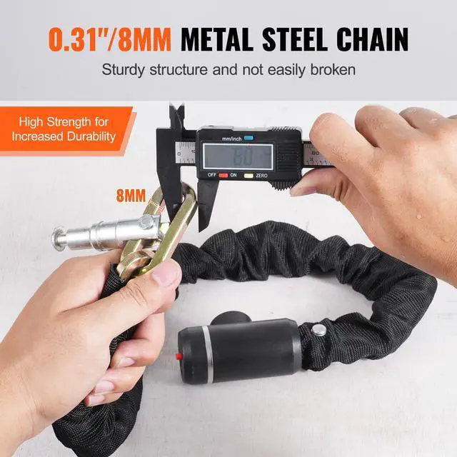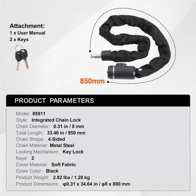 Total Length: 34.64 in / 880 mm,Cover Color: Black,Locking Mechanism: Key Lock,Chain Shape: 4-Sided,Keys: 2,Model: 85911,Cover Material: Soft Fabric,Product Weight: 2.82 lbs / 1.28 kg,Style: Integrated Chain Lock,Chain Material: Metal Steel,Product Dimensions: 0.31 x 34.64 in / 8 x 880 mm,Chain Diameter: 0.31 in / 8 mm