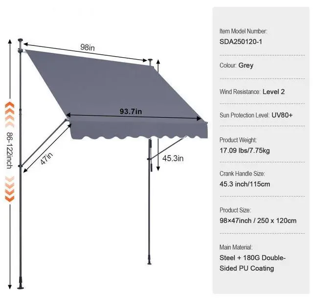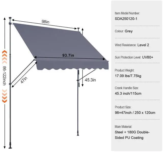 Crank Handle Size: 45.3 inch/115cm,Item Model Number: SDA250120-1,Wind Resistance: Level 2,Product Weight: 17.09 lbs/7.75 kg,Main Material: Steel + 180G Double-Sided PU Coating,Sun Protection Level: UV80+,Colour: Gray,Product Size: 98 × 47 inch/250 x 120 cm