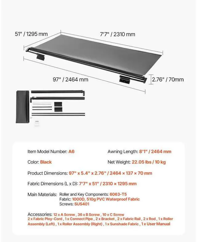 Fabric Dimensions (L x D): 7'7" x 51" / 2310 x 1295 mm,Main Materials:,Awning Length: 8'1" / 2464 mm,Screws: SUS401,Color: Black,Item Model Number: A6,Roller and Key Components: 6063-T5,Product Dimensions: 97" x 5.4" x 2.76" / 2464 x 137 x 70 mm,Fabric: 1000D, 510g PVC Waterproof Fabric,Net Weight: 22.05 lbs / 10 kg