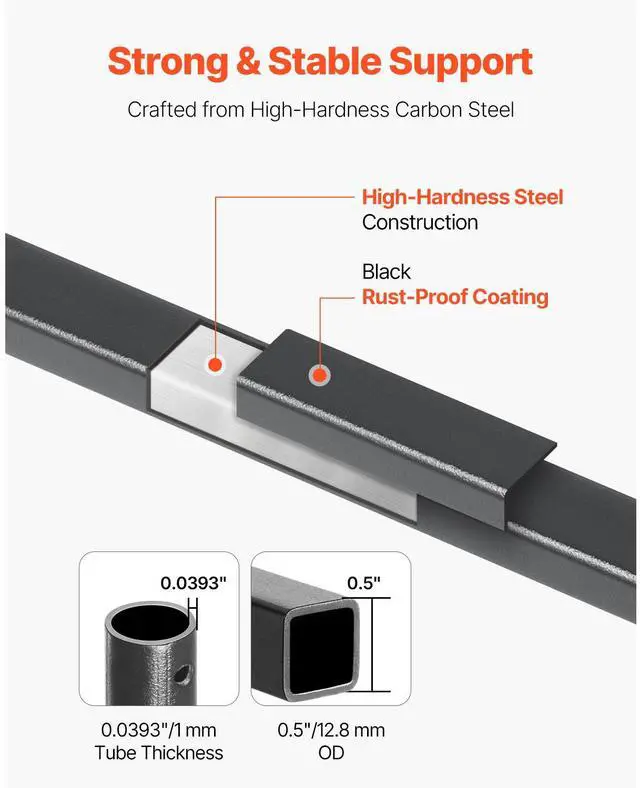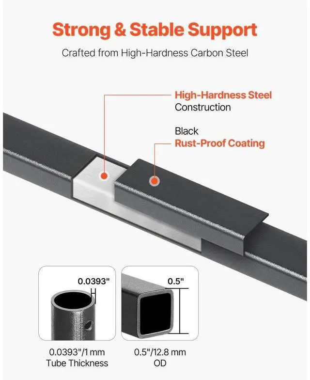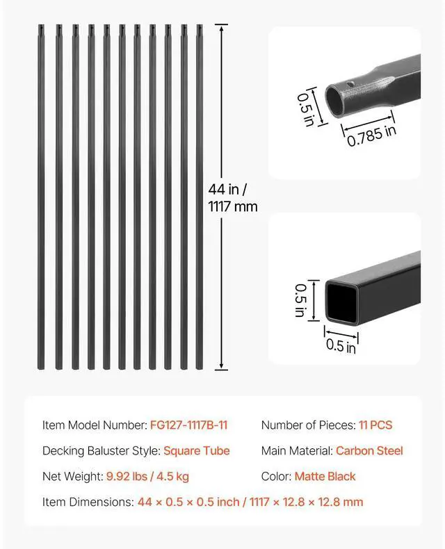 Number of Pieces: 11 PCS,Color: Matte Black,Item Model Number: FG127-1117B-11,Decking Baluster Style: Square Tube,Item Dimensions: 44 x 0.5 x 0.5 inch / 1117 x 12.8 x 12.8 mm,Net Weight: 9.92 lbs / 4.5 kg,Main Material: Carbon Steel