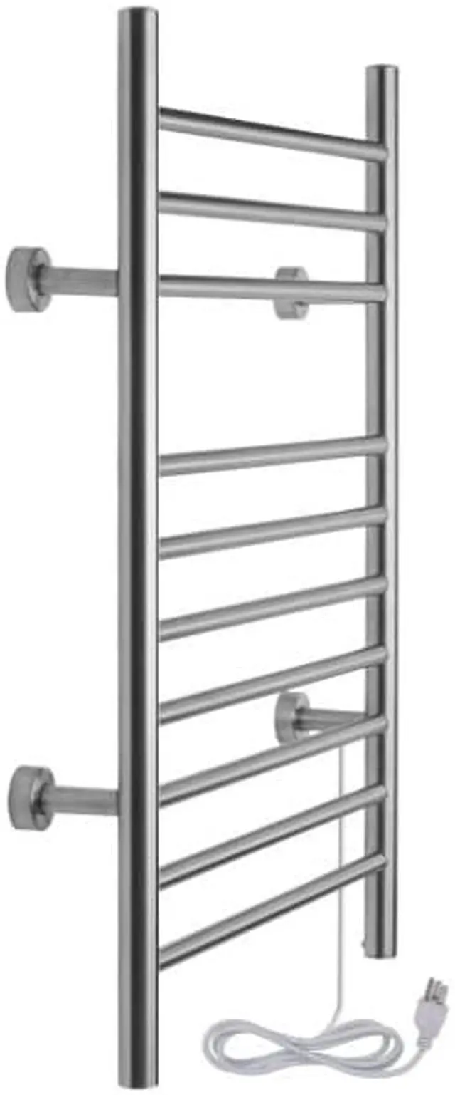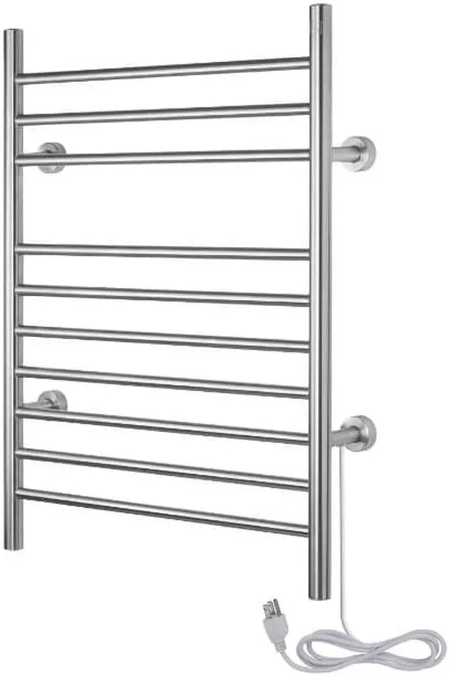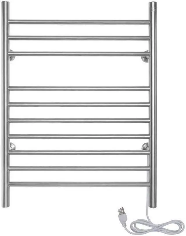 Imagine stepping out of the shower every morning and being able to use fresh-from-the-dryer towels. Now imagine not having to throw your towels in the dryer every morning or run to the laundry room after your shower. The WarmlyYours Infinity electric towel warmer allows you to do just that. With ten bars, this towel rack is convenient and versatile, with enough space for 2 large towels to be warmed at one time. The Infinity towel warmer is made of stainless steel and features a beautiful brushed-metal finish. This model has ten sleek bars, from which you can hang your towels or bathrobe for a cozy, luxurious experience every day. Step out of the shower or bath every day and wrap yourself in freshly-warmed towels. This towel warmer is also dual connection, meaning it can be used as is to plug into a standard 120 VAC outlet or it can be modified by a licensed electrician to have a hardwired 120 VAC electrical connection. And when this towel warmer is installed with a hardwired electrical connection, its unique design means there is no unattractive and cumbersome cover plate required. Additionally, this towel warmer is extremely safe and is cETLus listed. The Infinity comes with an LED power switch and TempSmart overheat protection to prevent the units surface temperature from exceeding 176F (80C). The Infinity is covered by our 2-year manufacturers for peace of mind. Optional towel warmer controls sold separately. Features: Dimensions: 23.6" (600 mm) W x 32" (813 mm) H x 4.75" (121 mm) D150 watts, heat output of 512 BTUs per hour10 heated straight barsBrushed finish, 304-stainless steel constructionDual connection (120 VAC) can be used plug-in or hardwired (with modification)Integrated power switch with indicator lightSafe: cETLus listed with built-in overheat
