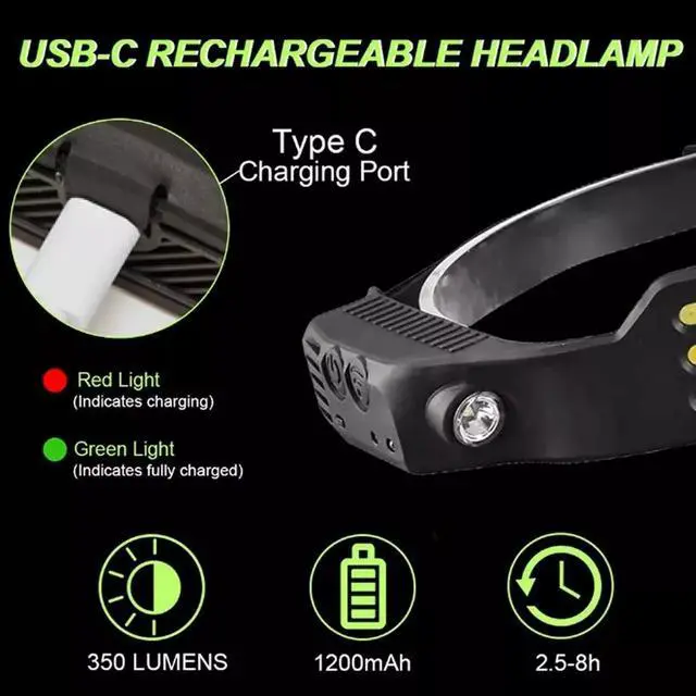 USB Rechargeable Headlamp: Built-in rechargeable 1500mAh large capacity battery. Not only saves the cost of replacing batteries but environmentally friendly.