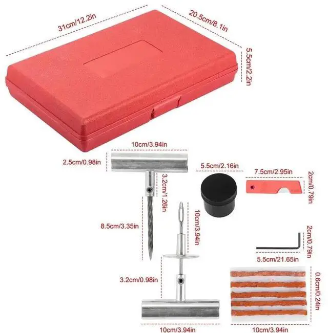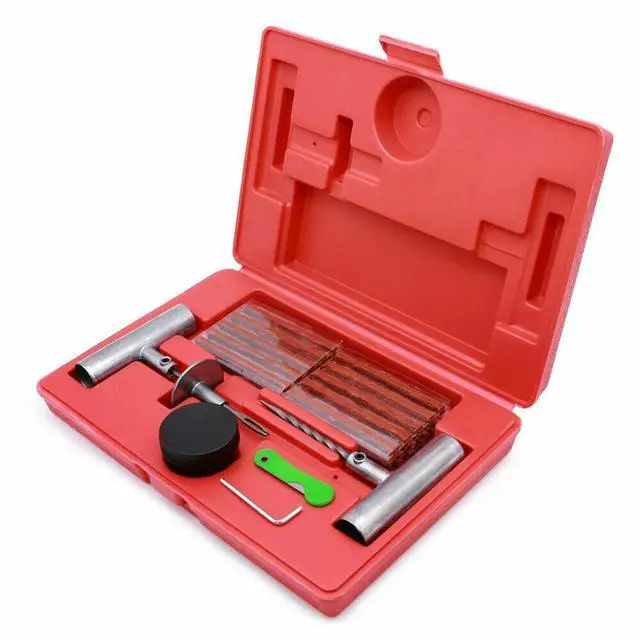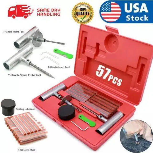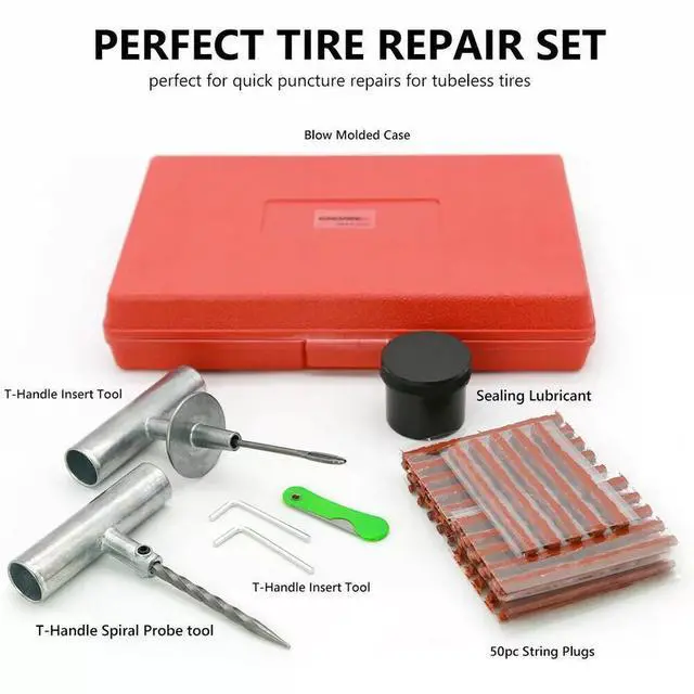 Economic But Reliable: Our tire repair tools kit totally includes 57 pcs-1pcs T-handle insert tool, 1pcs T-handle spiral probe tool, 2pcs hex keys, 1pcs sealing lubricant, 1pcs knife, 1pcs carrying case and 50pcs string plugs to repair your tubeless tires.