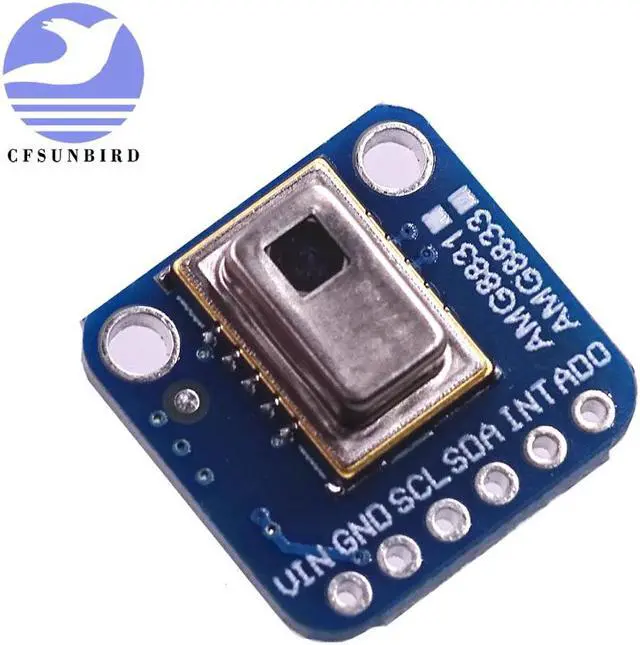 El AMG8833 es la próxima generación de sensores térmicos IR 8x8 de Panasonic, y ofrece un rendimiento más alto que su antecesora, El AMG8831. El sensor solo admite I2C y tiene un pin de interrupción configurable que puede disparar cuando cualquier píxel individual supera o supera el umbral establecido.
