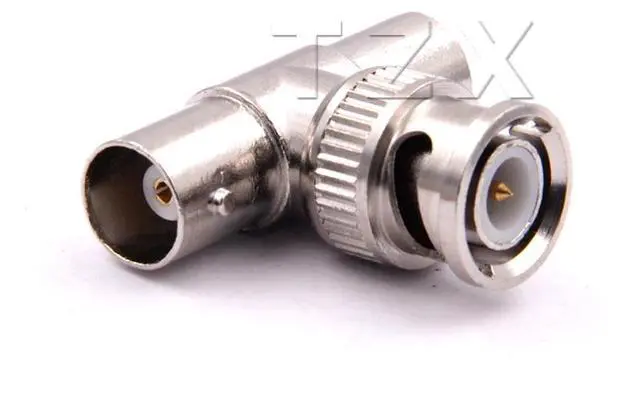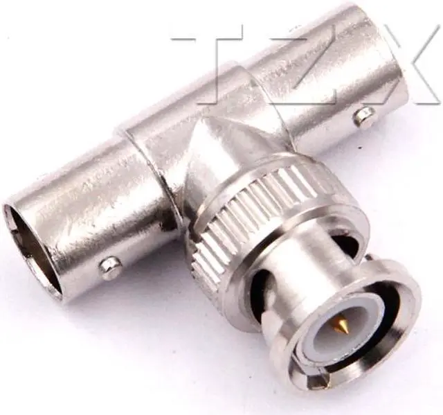 This nickel-plated T-shaped coaxial adapter has 2 BNC female connectors opposite one another with 1 BNC male connector at a right angle.