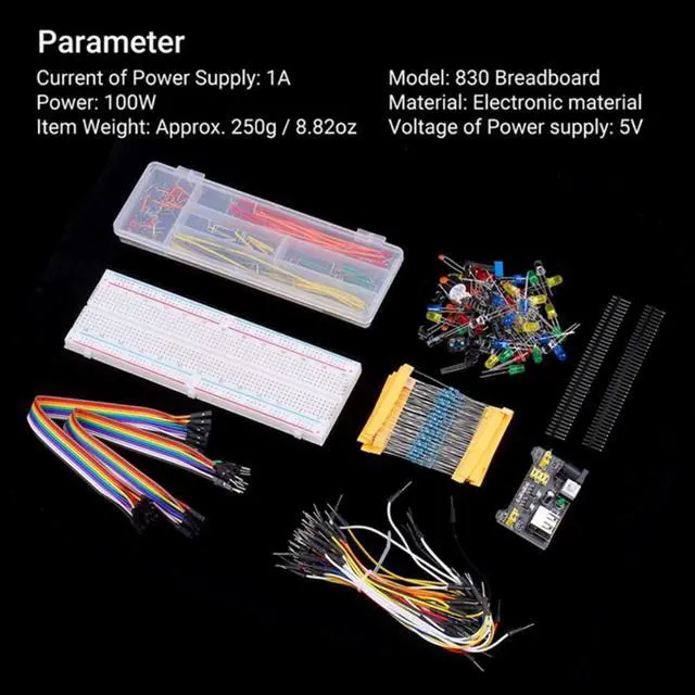 We provide more resistors (40 pieces for 220 ohms and 20 pieces for others, but other sellers are only worth 10 pieces each), so you can use them enough without paying extra to buy them. The circuit board is equipped with a power supply, you can set one side to 5VDC and the other side to 3.3VDC. It has a push button switch to turn the power on or off. In addition, we also provide a male-to-male USB power cord, which is difficult to find, but other sellers do not provide it.