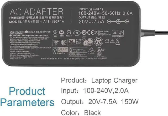 20V 7.5A Charger fit for Asus ADP-150CH B A18-150P1A Rog G531GT G731GT FX505GT FX705GT FX505DD FX505DT FX505DU FX70