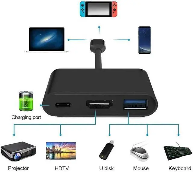 Hub with USB PD function: 1xUSB 3.1 + 1xHDMI-Compatible + 1xUSB Type-C charging port, Perfect support for Nintendo Switch, Samsung S8/S8+, / Pro, USB flash disk, camera, removable hard drive, mouse, keyboard or other USB A 2.0/USB A 3.0 devices