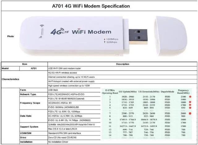 4G LTE USB Modem Network Adapter With WiFi Hotspot SIM Card 4G Wireless Router For Win XP Vista 7/10 Mac 10.4 IOS A701