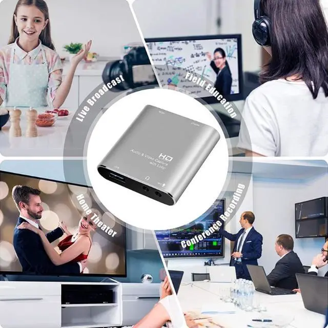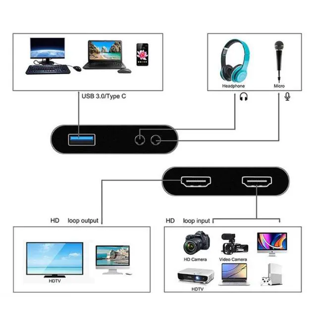 Product application: Connect the HDMI input end of the capture card to the signal source, the HDMI output end to the display port, and the Mic end to the microphone to perfectly realize high-definition acquisition, video recording, video live broadcast, teaching recording, medical imaging, game live broadcast, and video live broadcast , Recording high-definition video of the camera, etc.PS: When this product is connected to an active speaker through the audio port, if you unplug the USB port first, noise may be generated, which is a normal phenomenon.