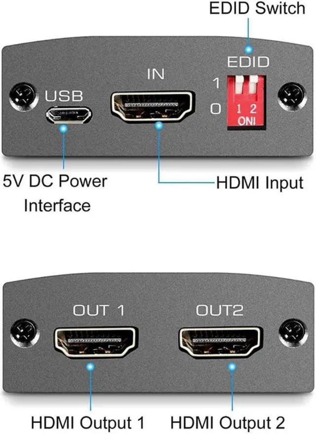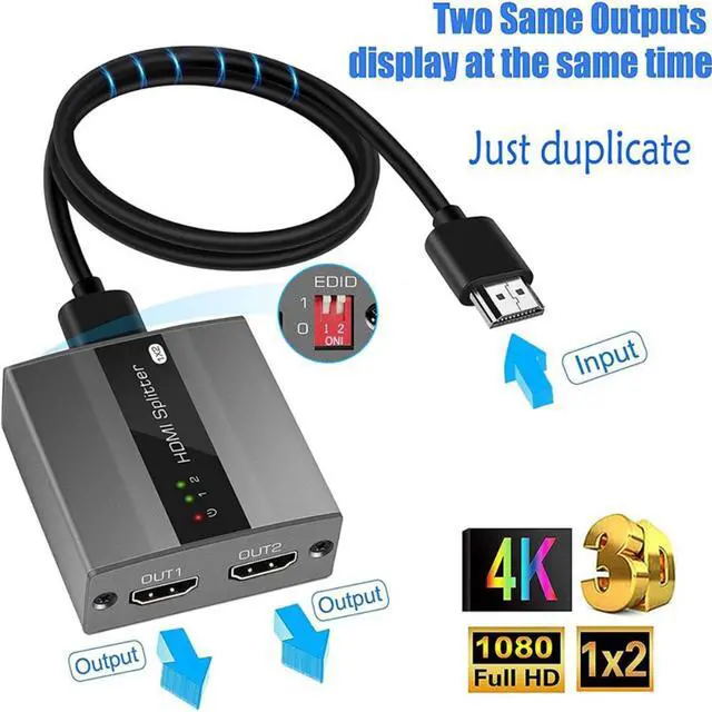 2 Same Outputs displayed at the same time:Updated HDMI SPLITTER 1x2 Support EDID Function for Output,provide more stable signal to ensure compatibility with your output. This HDMI SPLITTER distributes audio and video signal from a single source(such as Computer)to 2 outputs(Such as TV,projector, monitors),and both outputs show the same things simultaneously.With the SPLITTER box,you can set the desired output signal.Just duplicate,will not provide two different outputs