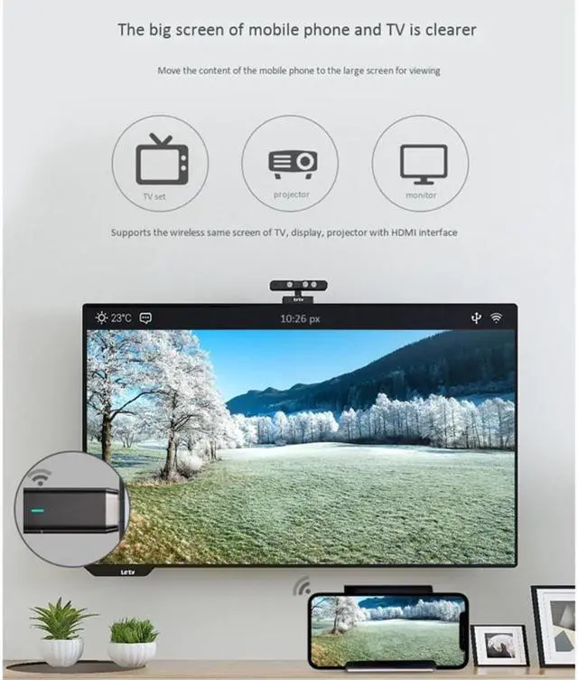 1. Compatible with various devices, support Android/ iOS; widely applicable, support HDMI devices such as projector/monitor/HDTV