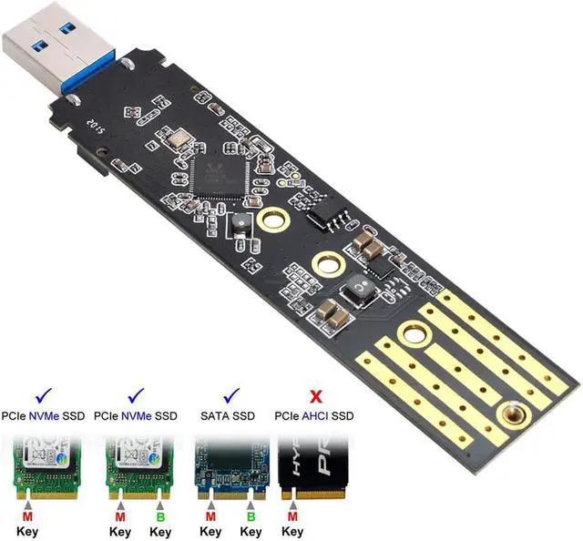 USB 3.0 to M.2(NGFF) NVME/SATA Storage adapter, providing one USB 3.0 connector on the host connection and one 67pin B key M.2 connector on the SSD storage devices connections.