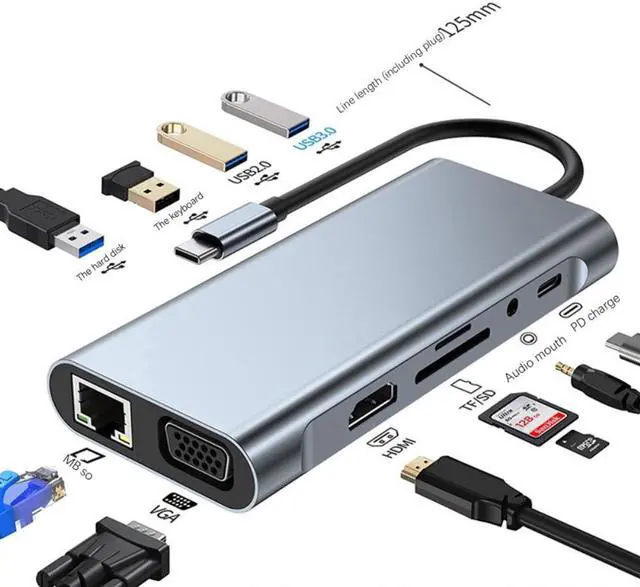 11 in 1 USB3.0 VGA Rj45 Hub Adapter with 4K HDMI-Compatible Multiport Card Reader Sd TF PD Video Multi Ports Adapter