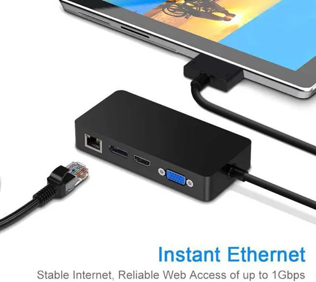 2. High speed data transfer and networking; Surface dock uses surface connect technology which enables high-speed transfer of video, audio and data over 3-USB 3.0 ports, ultra-fast data transfer with a rate of up to 5Gbps. Surface pro LAN adapter provides full 10/100/1000 Mbps over Gigabit Ethernet port, download movies and large files in a few seconds.