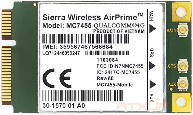 MC7455 PCI Express Mini Card is a compact, lightweight, wireless LTE-Advanced and UMTS based modem. It provides LTE-FDD, LTE-TDD, DC-HSPA+, HSPA+, HSDPA, HSUPA, WCDMA, and GNSS connectivity for networking, and M2M applications over several radio frequency bands and supports 3G roaming. MC7455 is a 4G LTE cat.6 module (FDD & TDD), with a down link data rate of up to 300 Mbps, primarily for Europe, North and South America. Support for Carrier Aggregation (CA) and MIMO. Fall back to 3G DC-HSPA+ with Rx diversity. It has a brother model Sierra MC7430 which is also a LTE Cellular module with Category 6.