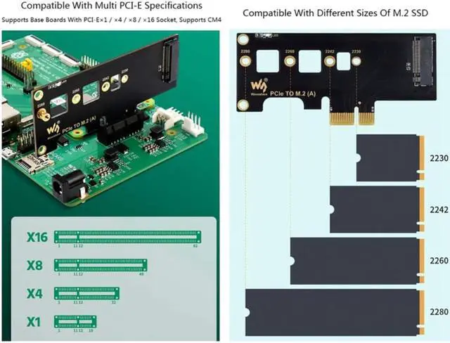 Waveshare For Raspberry Pi CM4 PCI-E To M.2 Adapter Card SSD Solid State Drive Card Suitable For PCI-E X1/X4/X8/X16 Interface