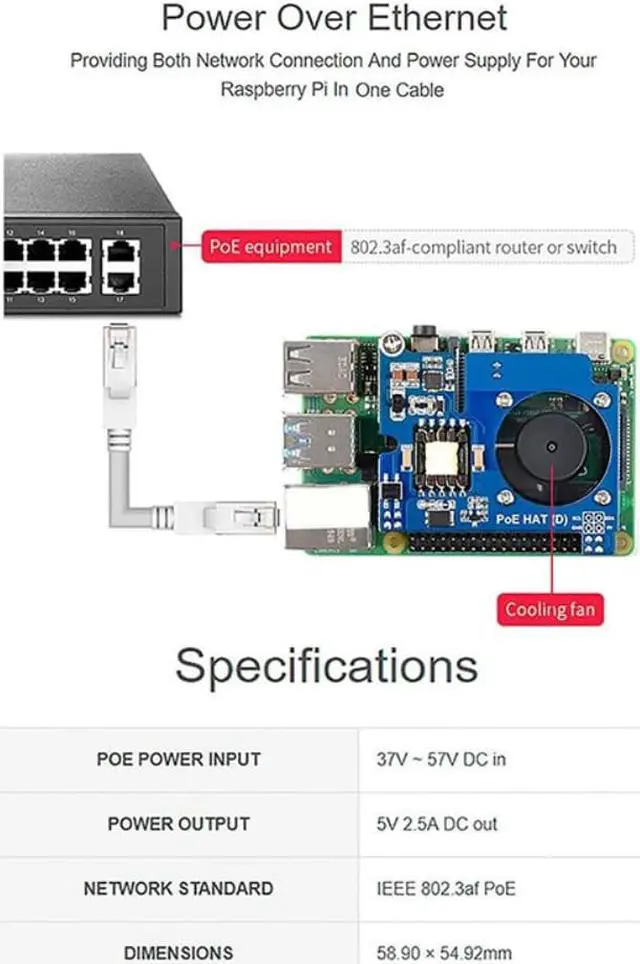 Power Over Ethernet HAT (D) for Raspberry Pi 4B/3B+, PoE HAT with Cooling Fan,Compatible with for Raspberry Pi 4B/3B+