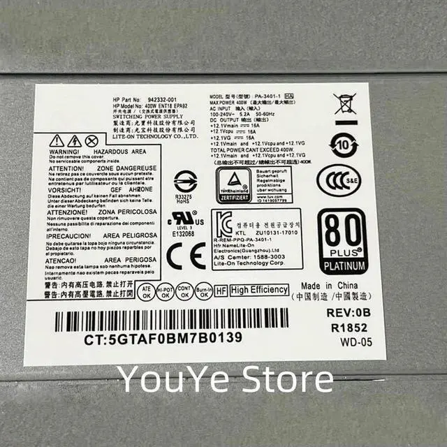• PSU For HP 86 89 280 480 400 600 800G3 G4 G5 400W Power Supply PA-3401-1HA 942332-001 PA-3401-1