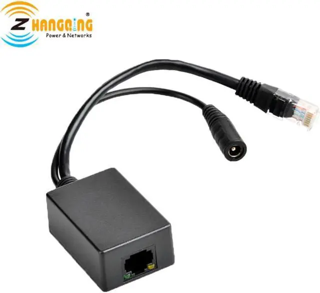 Power into the device is either from the 2.1mm DC connector OR from the RJ45 male pins 4,5 + (plus) and 7,8 (minus). The device passes 10/100/1000 Ethernet.