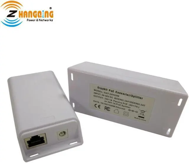 This device provides a low cost solution for delivering power to a 24 volt device over 328ft of network cable. This scheme allows power to be carried on 10/100/1000 networks over active data pairs of a CAT5E, CAT6 or CAT7 Ethernet network cable. Use with any passive or 802.3af PoE switch or multiport PoE injector. This device also can work as 24V 1A PoE Spitter.