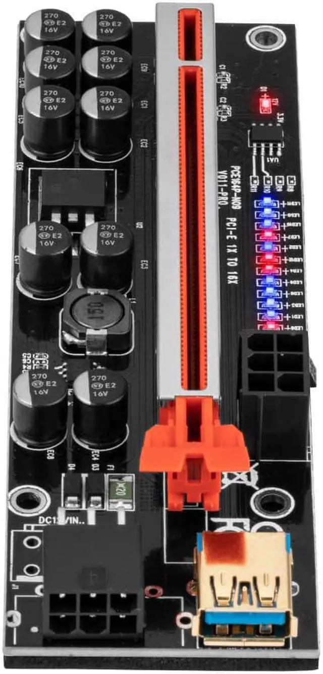 Version 011 Pro riser kits are the est and top of the line solution for setting up GPU mining rigs. Two Graphic card 6PIN interface are optional to power, which provides Graphic card independent power and reduces motherboard burden when using more Graphic cards. LED Display board, 10 Solid Capacitors, 60cm USB 3.0 cable, Suitable for all Window systems, LINUX and MAC.
