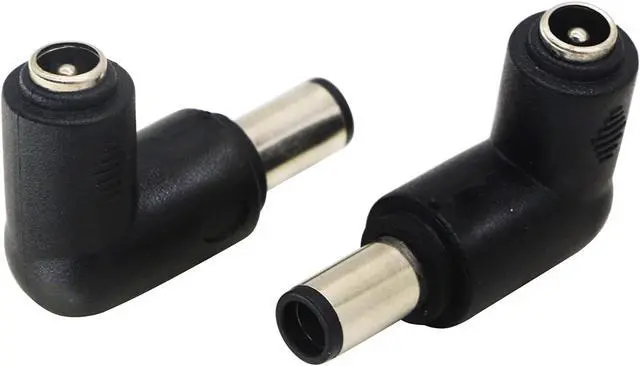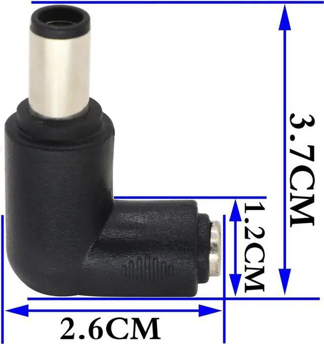 Size:(3.7x2.6x1.2cm) Colour:(black) Package Quantity:(2pack) Material:Metal PVC, ABS Shell. Features90 Degree Angle 7.4 mm x 5.0 mm male DC port to DC 5.5 x 2.1mm female port adapter Coupler