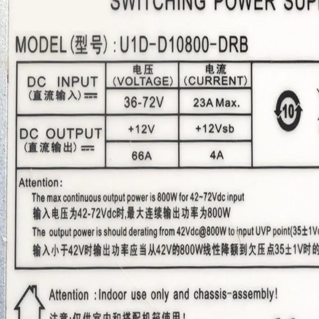 PFC Type:Active Package:Yes Application:Server Model Number:U1D-D10800-DRB Input Voltage:36-72V 80 PLUS Certification:80 PLUS PLATINUM Rating Power:701W - 800W Certification:CE,FCC,RoHS,UL Origin:Mainland China