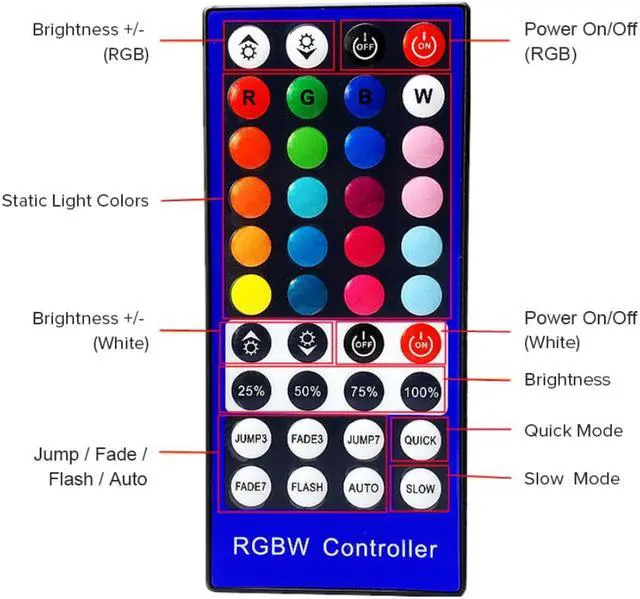 This RGBW Controller is divided into RGB and W two parts, it can be Turn on/OFF RGB Part and W part independently, and can controlled their brightness and their color independently. such as,when turn on RGB part, it can change RGB part's color and brightness;and can turn on W parts at the same time ,and can turn on/OFF W part or adjust its brightness .when at 3/7 color Fade model,can adjust their changing speed;when at 3/7 Color Jump mode,can adjust their brightness and adjust changing speed.