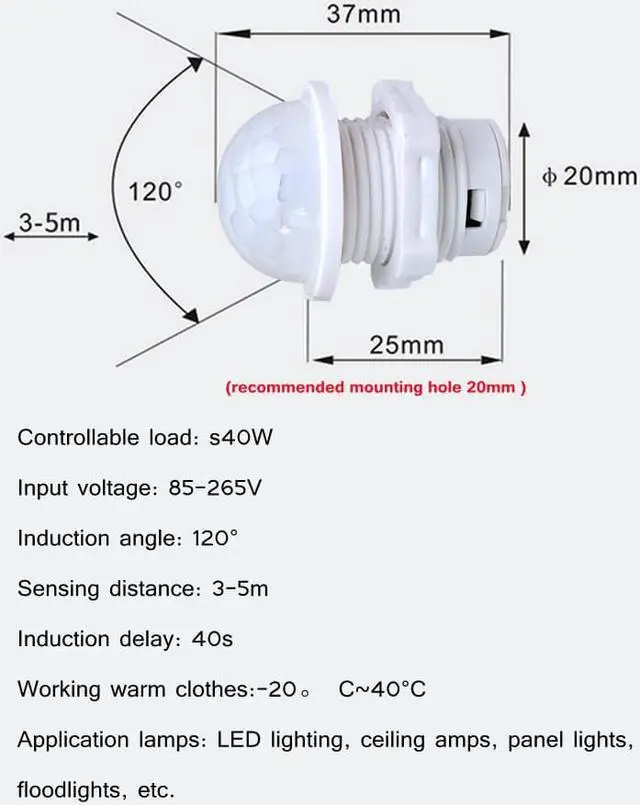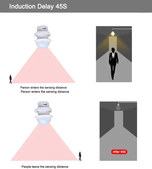 2. In an environment with no light, when someone enters the sensing area, the sensor probe will start when it senses the human body temperature. It is an automatic product that turns on and off the lamp (there may be a 45s time delay)