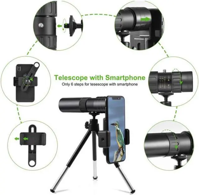 Comes with a smartphone holder and tripod connector at the bottom of the monocular. The stand can better adapt to the phone, allowing you to take beautiful photos. The adjustable monocular can be easily and quickly for the best viewing effect.