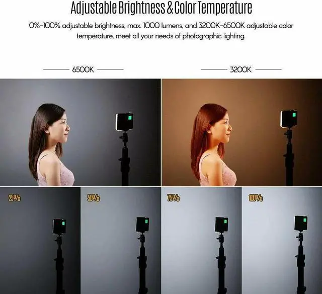 0%-100% adjustable brightness, max. 1000 lumens, and 3200K-6500K adjustable color temperature, meet all your needs of photographic lighting.