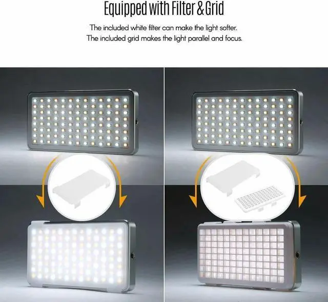 The included white filter can make the light softer. The included grid makes the light parallel and focus. Good for photography. The video light can be used in many scenes, such as television shooting, live streaming, interview, selfie, still photography and so on.