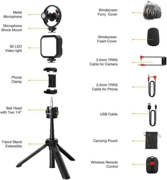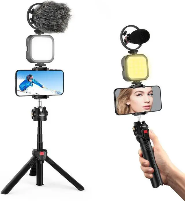 • CAMOLO Photography Kits Microphone Fill Light Lamp Phone Clip Tripod with Ballhead Wireless Bluetooth Remote Control for Vlog