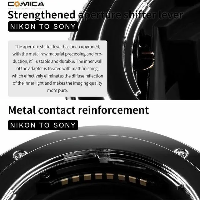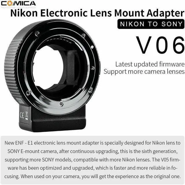 Commlite CM-ENF-E1 PRO Electronic Auto Focus Aluminum Alloy Lens Adapter which Support Aperture Control, VR Stabilizer & EXIF Parameter Transmitting. It is perfect for your Nikon F Lens To Sony E-mount Camera.