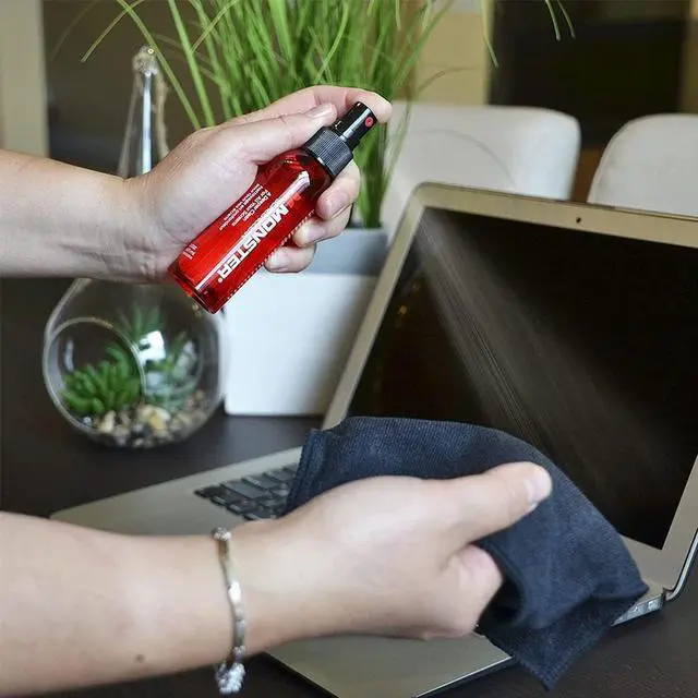 Turn off your electronic device, keep screen completely cool, spray the screen clean onto the supplied microfiber cloth, then use the microfiber cloth to clean your device; be sure that the cleaner is compatible with your display before using.