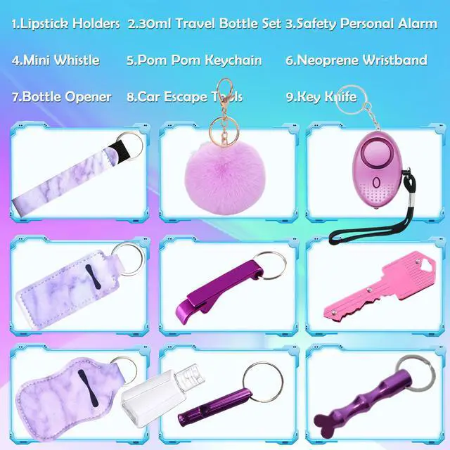 Safety Keychain Set for Woman with Personal Safety Alarm, Pom Pom and Lip Balm Lanyard Wirstlet Purple