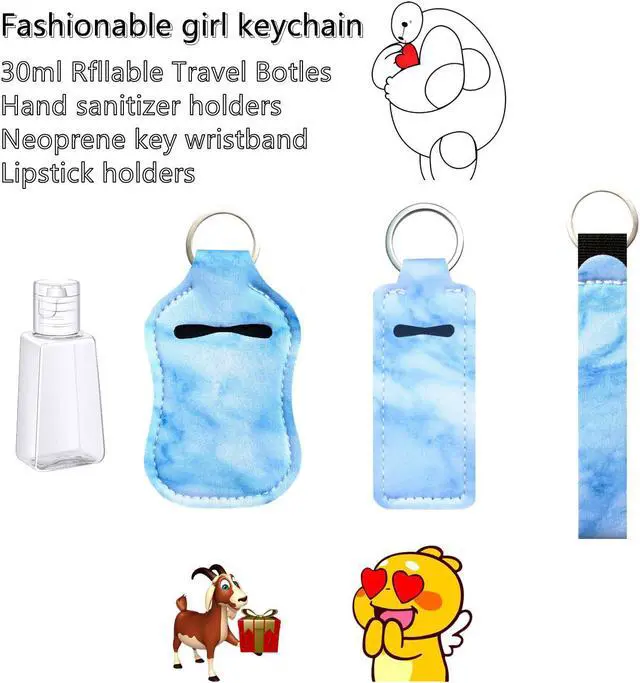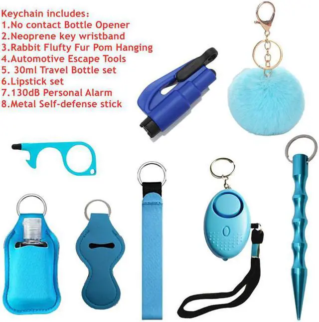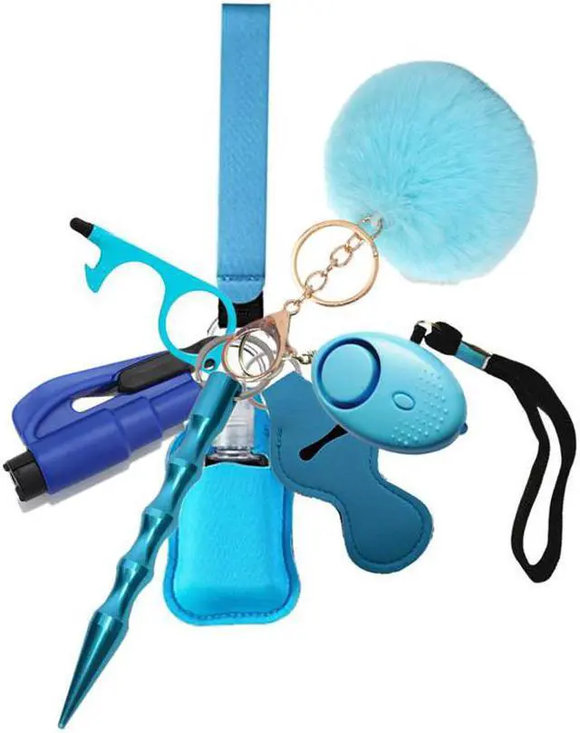 Safety Keychain Set for Woman with Personal Safety Alarm, Pom Pom and Lip Balm Lanyard Wirstlet Blue