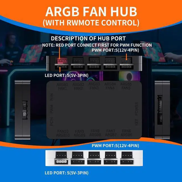 - [Sleek 3.83-Inch Build]At 3.83 x 2.33 x 0.6 inches, this argb pwm fan hub tidies up your computer cases internal cabling with style. (Heads-up: The pc fan speed controller hub is for lighting control onlyplug into the motherboards 12V 4-pin port for PWM fan operation.)