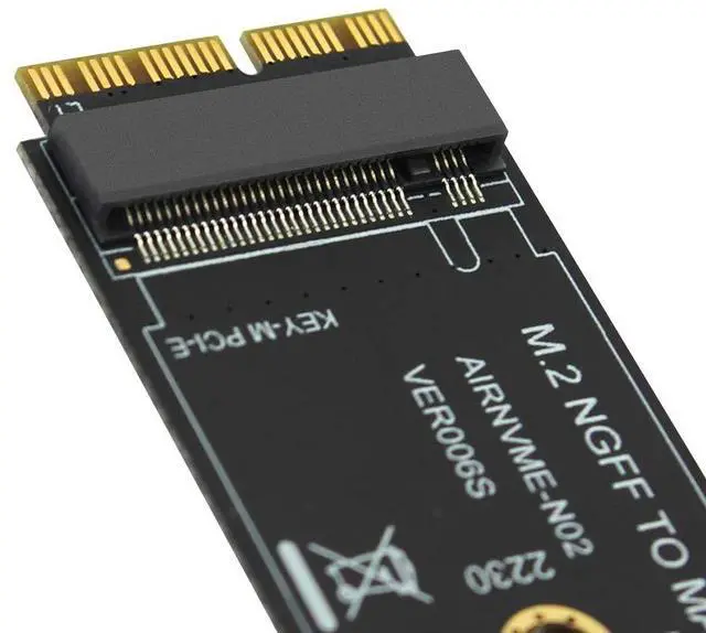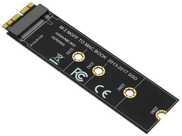 Features: 1. This product only compatible with late 2013 version Mac-book air A1465 and A1466, late 2013 version Mac-Book Pro re-tina A1398 A1502, Please confirm that your laptop is fit. The adapter card support 2230, 2242, 2260, 2280 size of M.2 NGFF PCIe x4 AHCI Protocol SSD, it can not support M.2 NGFF PCIe x4 NVMe solid state drives. 2. The speed and other properties is not changed,only form conversion interface. 3. No need extra power adapter and any drivers. This product only supports the following computer models: Late 2013 version Mac-Book Pro re-tina A1398 A1502 (ME864 ME865 ME866 ME293 ME294), 2014 version Mac-Book Pro re-tina A1502 A1398 (MGX72 MGX82 MGX92 MGXA2 MGXC2), 2015 version Mac-Book Pro re-tina A1502 A1398(MF839 MF840 MF841 MJLQ2 MJLT2 MJLU2), 2013-2014 version Mac-Book Air A1465 A1466(MD711 MD712 MD760 MD761), 2015 version Mac-Book Air A1465 A1466(MJVM2 MJVP2 MJVE2 MJVG2 MMGF2 MMGG2), 2017 version Mac-Book Air A1466(MQD32 MQD42 MQD52, Model A1466 EMC3178), Mac Pro ME253 MD878, i-MAC A1419(Late 2013 and newer). Package included: 1 x M key M.2 to 12+16Pin interface Adapter Card