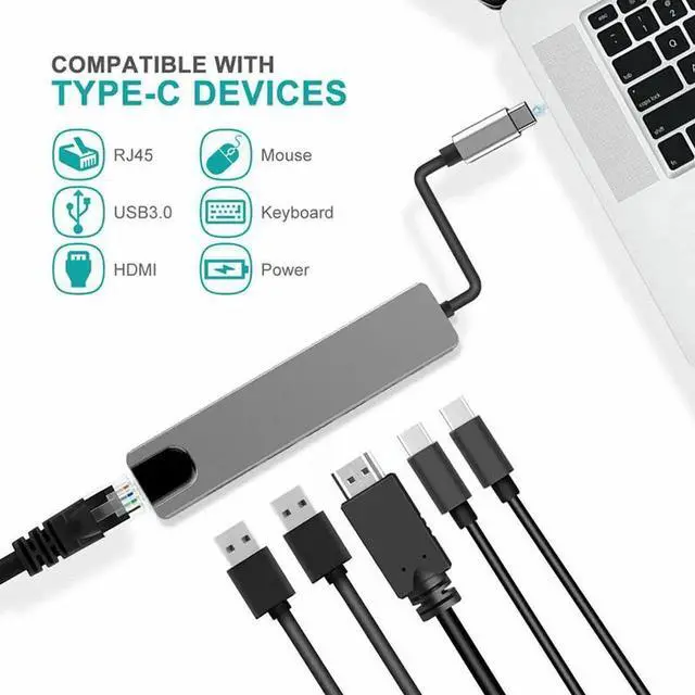 Multiport USB C Adapter: USB-C Hub with 4K HDMI-compatible video output, 2 x USB 3.0 female ports 2 x USB TYpe-C Ports and 1000 Mbps Ethernet adapter