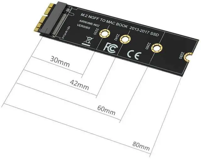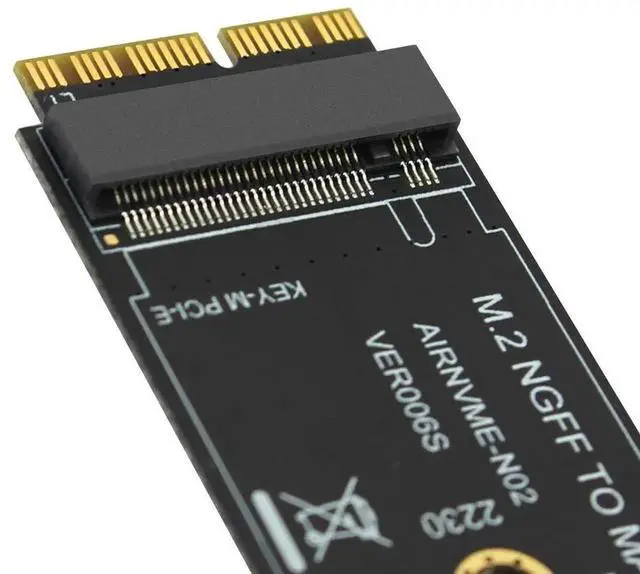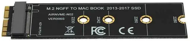 Features: 1. This product only compatible with late 2013 version Mac-book air A1465 and A1466, late 2013 version Mac-Book Pro re-tina A1398 A1502, Please confirm that your laptop is fit. The adapter card support 2230, 2242, 2260, 2280 size of M.2 NGFF PCIe x4 AHCI Protocol SSD, it can not support M.2 NGFF PCIe x4 NVMe solid state drives. 2. The speed and other properties is not changed,only form conversion interface. 3. No need extra power adapter and any drivers. This product only supports the following computer models: Late 2013 version Mac-Book Pro re-tina A1398 A1502 (ME864 ME865 ME866 ME293 ME294), 2014 version Mac-Book Pro re-tina A1502 A1398 (MGX72 MGX82 MGX92 MGXA2 MGXC2), 2015 version Mac-Book Pro re-tina A1502 A1398(MF839 MF840 MF841 MJLQ2 MJLT2 MJLU2), 2013-2014 version Mac-Book Air A1465 A1466(MD711 MD712 MD760 MD761), 2015 version Mac-Book Air A1465 A1466(MJVM2 MJVP2 MJVE2 MJVG2 MMGF2 MMGG2), 2017 version Mac-Book Air A1466(MQD32 MQD42 MQD52, Model A1466 EMC3178), Mac Pro ME253 MD878, i-MAC A1419(Late 2013 and newer). Package included: 1 x M key M.2 to 12+16Pin interface Adapter Card