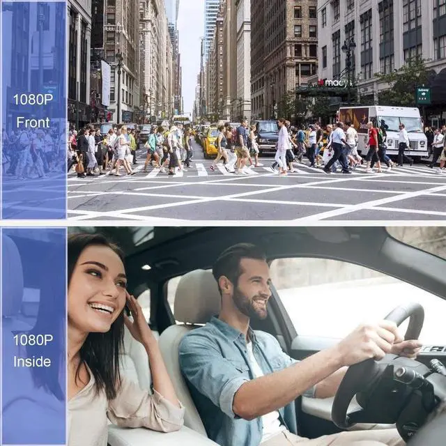• HD Front&Inside Dual Dash Cam-The dual dash cams is equipped with an advanced chip and sensor, can simultaneously record videos with 1080P the front and inside respectively, clearly capturing license plates, road signs and inside the cabin details, save more detailed evidence.
