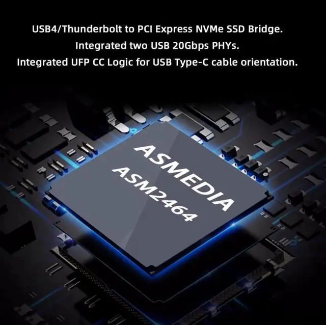 The ASM2464 chipset NVMe Enclosure 40G transforms your M.2 NVMe SSD into a compact and portable mobile hard drive enclosure. Equipped with the latest ASM2464 chip, it is compatible with Thunderbolt3/4 and supports PCIe and USB Dual Tunnels.