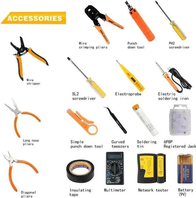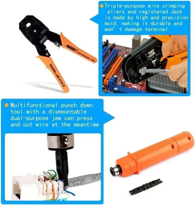 Higher performance RJ45 crimp tool,It cuts, strips and terminates RJ11/12 and RJ45 extended copper wires with a precision die head that provides 360 degrees of connector support during the crimping cycle. More powerful than others when you network repair kits in the market.