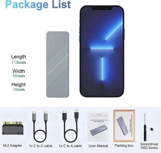 What You Will Get: 1*USB 3.2 Gen 2 m. 2 ssd enclosure, 1*USB C to USB C Cable, 1*USB C to USB A Cable, 1*SSD Screw, 4*SSD Case Screw, 1*Screwdriver, 1*m. 2 Adapter.